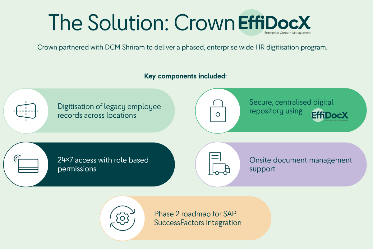 Through industry references, HR fraternity recommendations, and online research, Crown FE Docs emerged as the right partner—offering enterprise‑scale digitisation, strong security, and a clear roadmap for integration with SAP SuccessFactors.