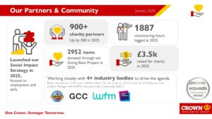 In early 2025, Crown UKI launched a social impact strategy designed to support our communities in a way that is informed, impactful and quantifiable. Our aim is to contribute to economic development and quality of life in the areas in which we operate whilst driving progress towards our three-pillar strategy, living our values and contributing towards the global UN Sustainable Development Goals.