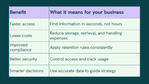 Organisations that digitise their information typically see a reduced time spent searching for documents, as staff can access what they need quickly through secure, searchable systems. This also leads to fewer compliance and audit issues, since records are governed consistently and retention rules are easier to apply.